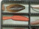 シャッドテールワーム: 魚の形をしており、テール(尾)がシャッド(ニシン科の魚)の形をしています。泳がせるとテールが振動し、魚に強くアピールします。サワムラの「ワンナップシャッド」やO.S.Pの「ドライブシャッド」など類似製品が多く存在します。