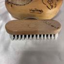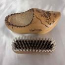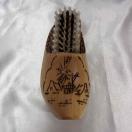 ●本体は木製で、おそらく天然木が使用されています。表面には、風車や花などの手書き風のイラストが描かれています。ブラシの毛は、黒と白の繊維でできています。
