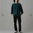 ベロア素材で、やや薄手のスウェットになります。ロンT感覚で使えると思います。