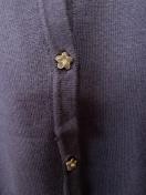 落ち着いた深みのあるパープルカラーが魅力の、クルーネックカーディガンです。中央にラインストーンがあしらわれた花形ボタンが上品なアクセントになっています。