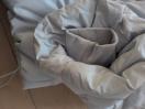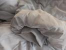 フード付きのダウンジャケットです。袖口はリブになっており、内側は暖かい仕様です。着回ししやすいライトグレー系の色合いです。