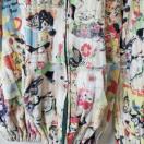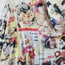 ◆薄手のコットンニットのような生地で、縦に線が6本入った編みとと穴の開いた透かし編みの2種類の織りに、全体的にレトロな絵柄の何種類かの猫、犬、クマ、ウサギ、象、ヒヨコ、ネズミ等の動物柄とお花、英字等がカ
