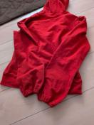 赤いジップアップパーカーです。前面にジッパーが付いています。
