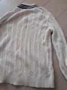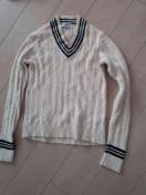 オフホワイトのVネックケーブルニットセーターです。全体にケーブル編みが施されており、襟元と袖口にはネイビー(またはブラック)のラインが入ったクラシックなデザインです。カジュアルにもきれいめにも様々なスタイルに合わせやすいアイテムです。目立った傷や汚れはなく、比較的良好な状態です。丈が短い感じです。下が広がっています締切日時