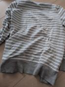グレーと白のボーダー柄が爽やかなカーディガンです。胸元にはエンブレムのワッペンが付いています。カジュアルなコーディネートに活躍します。