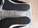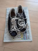 アディダス製の黒色のメッシュスニーカーです。白い靴紐がアクセントになっており、カジュアルなスタイルに合わせやすいデザインです。インソールはコルク調の素材で、内部にadidasのロゴが確認できます。靴底はヘリンボーンパターンで、グリップ力がありそうです。普段使いや軽い運動などにおすすめです。全体的に使用感がありますが、まだお使いいただける状態です。締切日時