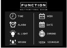 機能: 耐水性、アラーム、12/24時間、クロノ、エルライト、日付、週、月、