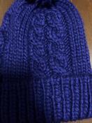 ポンポン付きのケーブル編みニット帽、紫色。