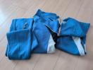 青色のスポーツウェアセットです。写真の通り、青を基調としたウェアが複数枚含まれています。一部には白や黒のラインデザインも見られます。折畳まれた状態で、木目の床に置かれています。上、短パンは、すれ、糸ほつれないようです。学校のジャージです。sサイズになります。名前刺繍入っています。取ってご使用ください