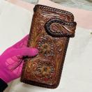 重厚感のある本革を使用した、ハンドメイドのレザークラフト・ロングウォレットです。使い込むほどに手に馴染み、深みを増していくブラウンレザーに、アクセントとなる大型コンチョが配された、男らしい武骨なデザインが魅力の一品です。