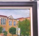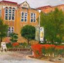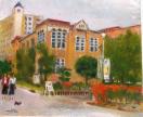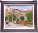 東大阪市の長瀬川沿いにある樟蔭女子大学の正門あたり、洋風校舎を描いた作品である。主題の洋風建築物は大学の資料(公開)によれば1927年(昭和2年)に建てられた記念館で登録有形文化財。歴史ある大学らしく年代を経た洋風建築が目を引く。ノスタルジックでアカデミックな情景を表現主義的に明快な筆致で描きました。(金山ヒロシ)締切日時