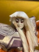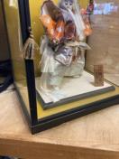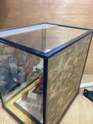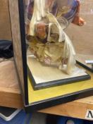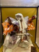 ガラスケースに入った日本人形です。舞踊人形のような衣装を身につけており、歌舞伎の演目を思わせる飾り物です。和室や玄関のインテリアとして飾っていただけます。