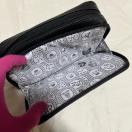 洗練されたデザイン: 外装はシックなブラックの合成皮革。中を開けると、ディプティックらしい芸術的でモダンな総柄が広がり、使うたびに心躍る仕上がりになっています。