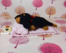 黒と茶色の毛色が特徴のダックスフンドが、ふわふわのピンクのベッドでくつろいでいる姿を表現しました。