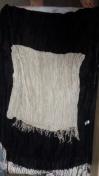 レーヨン20ポリエステル80で、二枚とも同じものでマフラー型で、巻くだけでお洒落感でて、ラメがきいていて、カジュアルから、ドレッシーまで使えます!黒は使用感ありで、ひっかけはありますので、格安にしてますし、ベージュは比較的綺麗ですが、細かいとこ気になるかたはご遠慮ください!是非重宝するので、おつかいくださいませ締切日時