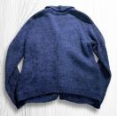 コットン100%のダークブルーカーディガン、ボタン付きで前面ポケットあり。