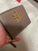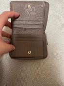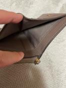 ブラウンのレザー製で、ファスナー付きポケットとカードスロットを備えた二つ折り財布。