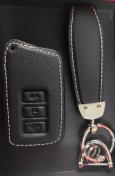 レクサス車用のスマートキーケースです。高品質な本革を使用し、高級感のある黒色に白いステッチがアクセントになっています。レクサスのロゴもあしらわれており、スマートキーを傷や汚れから守りつつ、愛車のドレスアップにも最適です。