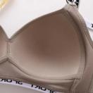 やわらかいポリエステル・ナイロン素材を使用した、ノンワイヤーのフルカップスポーツブラです。スポティッシュなデザインの中に、バストの間にあるアクセサリーが映える製品です。