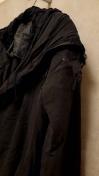内側に生地を付けフード等レイヤード仕様に仕上げ着用時には袖のたまり感で独特のシルエットに見せる為袖のリブを長くしてあり親指用のホールもありニットグローブ風にも見せられるデザイン。