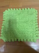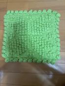 鮮やかなグリーンが目を引く、手編みのマットです。ポコポコとした立体的な模様が特徴で、触り心地もふっくらとしています。周囲には可愛らしいフリルが丁寧に編み込まれており、お部屋のアクセントにぴったりです。