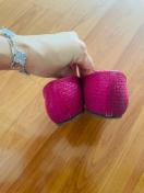鮮やかなピンクのパテント素材と、サイドのパンチング加工が可愛らしいデザインです。