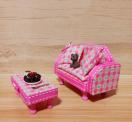 可愛らしいピンクのミニチュア家具セットです。ドールハウスのインテリアやコレクションにぴったりなアイテムです。