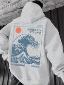 ビンテージスタイルのメンズフーディー - アメリカンウェーブサンライズをモチーフにしたポリエステルニット生地、カジュアルスタイルとフィットフード付き