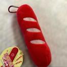 ウインナー型の赤いキーホルダー、カラビナ付きで持ち運び便利。