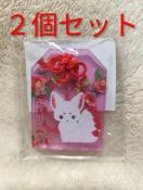 愛らしい白い九尾の狐と美しい椿の花がデザインされた、ピンク色のアクリル製お守りです。