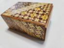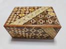 こちらは、伝統的な寄木細工の秘密箱です。様々な木材を組み合わせて作られた美しい幾何学模様が特徴です。