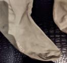 画像で確認できる通り、複数箇所に汚れや使用感が見られます。特に、足先やつま先部分、履き口付近に薄いシミや擦れがあります。これらは現状でのお渡しとなりますので、画像にて状態をよくご確認いただき、ご納得の上ご入札ください。