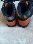 履き口部分にはカラフルなエスニック調の柄がアクセントになっており、普段使いのカジュアルなコーディネートに可愛らしい雰囲気をプラスします。かかと部分には、落ち着いたブラウンカラーの素材が切り替えで施されており、デザインのアクセントになっています。紐でしっかりと固定できるデザインで、履き心地も安定しています。