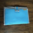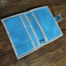 ナイロン製の青いパスポートケース、複数のポケットとジッパー付きで、マジックテープでしっかり閉じられます。