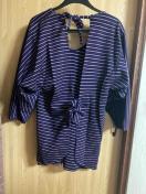 表示がありませんが若干肉厚のカットソーみたいな生地です。濃い紫にベージュと赤のラインです。(画像3 柄生地アップ)