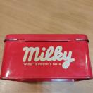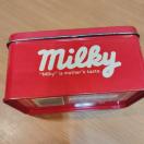 不二家の人気キャラクター、ペコちゃんがデザインされたミルキーのレトロな空き缶です。