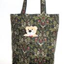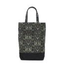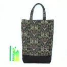 上品なアカンサス柄が特徴的なトートバッグです。落ち着いた緑系を基調とし、どんな装いにも合わせやすいデザインです。底部分は丈夫なブラックの生地で切り替えられており、デザインのアクセントにもなっています。