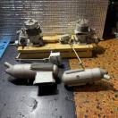 写真に写っているOS MAX FP グローエンジン2個セットです。ラジコン飛行機や模型の動力源として使用される小型エンジンで、マフラーなどの関連部品も付属しています。
