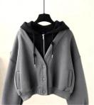 パーカーはカーディガンと重ね着しているように見え、おしゃれです。