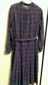 レトロな雰囲気が魅力のチェック柄長袖ワンピースです。パープル、ターコイズブルー、ネイビー、ホワイトを基調とした落ち着いた色合いのチェック柄が特徴です。スタンドカラーのデザインで、付属のベルトを締めることでウエストラインを強調し、スタイルアップ効果も期待できます。